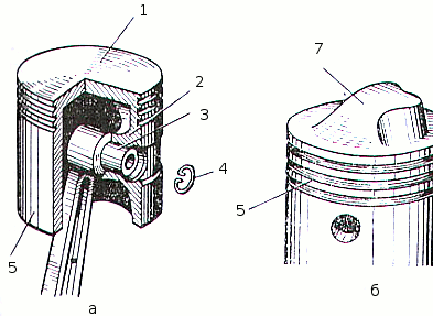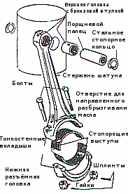 Наименования деталей поршня и шатуна понятны из рисунков. Внешняя поверхность торца поршня называется днищем, верхняя часть - головкой, нижняя его часть - юбкой. Для облегчения поршня и свободного прохода противовесов коленчатого вала при нижних положениях поршней нерабочая часть юбки может вырезаться. Поршни, изготовленные из алюминиевых сплавов, обычно имеют прорези, предупреждающие заклинивание поршня при нагреве и позволяют уменьшить зазор между юбкой поршня и цилиндром (гильзой). Поршневые кольца (компрессионные и маслосъемные) отливают из серого или легированного чугуна. Компрессионные кольца (1 - 2 шт.) устанавливаются сверху поршня, маслосъёмные, состоящие из 1-2 стальных кольцевых дисков с осевым и радиальным расширителями между ними, устанавливаются на поршень ниже компрессионных. Стык (замок) у колец чаще прямой. Поршневой палец изготовлен полым из легированной цементованной или углеродистой стали, закаленной нагревом токами высокой частоты. Сейчас практически на всех двигателях применяются т.н. плавающие пальцы, свободно проворачивающиеся в верхней головке шатуна м в бобышках поршня и удерживаемые от продольного перемещения пружинными стопорными кольцами, установленными в канавках бобышек поршня.