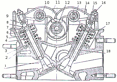 распределительный вал; 13 - ось коромысел впускных клапанов; 14 - коромысло