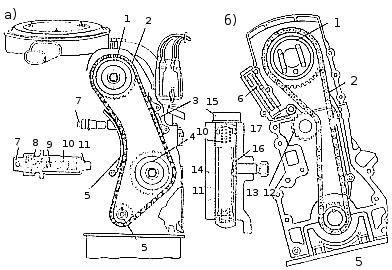 Рис. 85. Натяжение цепи привода распределительного вала: а - двигателей ВАЗ; б - двигателей автомобиля "Москвич-412"; 1 - звездочка распределительного вала; 2 - цепь; 3 - успокоитель; 4 - звездочка привода масляного насоса; 5 - звездочка коленчатого вала; 6 - башмак натяжителя; 7 - фиксирующая гайка; 8 - нажимный сухарь; 9 - регулировочный стержень; 10 - пружина; 11 - плунжер; 12 - звездочка натяжного устройства; 13 - стопорный винт; 14 - верхняя крышка картера; 15 - пробка; 16 - планка; 17 — рычаг.