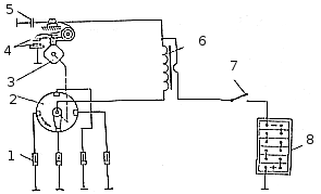 Рис. 101. Схема батарейного зажигания четырехцилиндрового двигателя: 1 - свечи зажигания; 2 - распределитель; 3 - кулачок прерывателя; 4 - контакты прерывателя; 5 - конденсатор; 6 - катушка зажигания; 7 - выключатель ("ключ") зажигания; 8 - аккумуляторная батарея