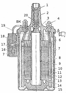 Устройство катушки зажигания несложно. Каждая состоит из первичной и вторичной обмотки. Вторичная мотка 13 намотана на втулку из эпектротехнического на и хорошо изолирована сверху несколькими слоями конденсаторной бумаги, лакотканью и кабельной бумагой, что уменьшает в значительной степени возможность ее пробоя. Сердечник и кольцевой магнитопровод 10 изготовлены из листов электротехнической стали. Первичная обмотка 12 намотана поверх вторичной и между каждым рядом обмотки прокладывается w слоев кабельной бумаги. Для предупреждения возможности разряда высокого напряжения на дно корпуса между кожухом катушки и сердечником помещен фарфюровый изолятор. Для улучшения изоляции обе обмотки пропитывают, а все пустоты заливают трансформаторным маслом 11, что, кроме изоляции, способствует теплоотводу на корпус. Герметичность крепления карбо-литовой крышки 2 в кожухе обеспечивается прокладкой из маслобензостойкой резины. Добавочный резистор 16 состоит из проволочной спирали, двух керамических держателей 18, винта и резьбовой втулки 17. Катушку зажигания для контактной системы зажигания с добавочным резистором рекомендуется заменить катушкой Б-117А без оного, но с прерывателем Р-119Б. При этом энергия искрового разряда немного повышается, а энергия, потребляемая системой, снижается вдвое.