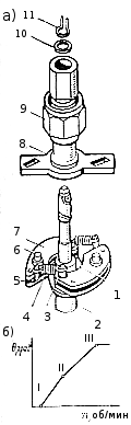 Рис. 104. Центробежный регулятор опережения зажигания прерывателей-распределителей Р4-В; Р13-В и др.: а - устройство; б - характеристика регулятора