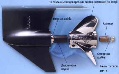 - Делриновая втулка системы Flo-Torq II помогает сгладить последствия неожиданных столкновений, сводя к минимуму повреждения двигателя, привода и гребного винта.