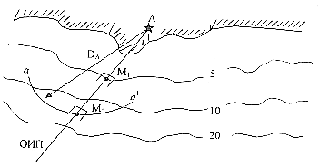 Теперь предположим, что измеренное (рассчитанное) расстояние до этого же ориентира составило DA , а измеренная лотом глубина -15 м. В этом случае радиусом DA проводится на карте дуга окружности аа1 и визуально (между изобатами 10 и 20 метров) отмечается изолиния, соответствующая измеренной глубине 15 м. Пересечение этой изолинии с линией положения аа1 даст опознанное место - точка М2 . При использовании лота рекомендуется учитывать и характер фунта в месте измерения.