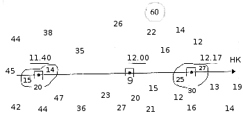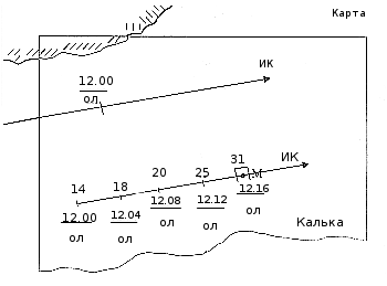 По курсу и глубинам. При отсутствии береговых ориентиров или в условиях плохой видимости, когда место судна определить невозможно, место можно опознать по курсу и глубинам. Для этого на карте измеряются расстояния между отметками глубин и рассчитываются промежутки времени, необходимые судну, при известной скорости, для прохождения этих расстояний. Затем, через рассчитанные промежутки времени делается 8-10 измерений глубин с отметками времени (если есть лаг, то отмечаются и его показания). После этого берется калька и на ней произвольно проводится линия истинного курса, вдоль которой наносятся счислимые точки в момент измерения глубин, а также значения этих глубин (рис.224). Калька накладывается на карту так, чтобы линии ИК на карте и кальке были параллельными, а отметки глубин совпадали.