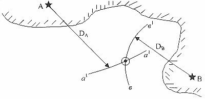 Пример: Измеренное (рассчитанное) расстояние до маяка А (рис. 218) составило DA = 5,2 мили, а до маяка В - DB = 3,5 м. Нанести на карте обсервованное место судна.