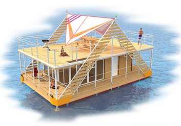 Его можно увеличить включив в него частично пространсво открытой нижней палубы. Еще одна особенность конструкции плавдома - возможность «свободной» планировки жилых помещений, что расширяет сферу его применения. Например, используя все пространство нижней палубы под один большой зал, дом на воде можно позиционировать, как плавресторан. Удачная компоновка конструкции основания может приобретаться и использоваться без верхней палубы как большой «плот», на котором можно установить, например, кемпер, или использовать его в качестве сцены на воде.
