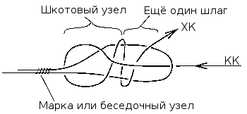 Брамшкотовый узел — дальнейшее развитие шкотового узла имеет повышенную надежность за счет добавления шлага вокруг петли под КК на конечном этапе вязки (рис. 17.10).