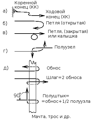 Термины, употребляемые при вязке узлов и обращении с тросами приведены на рис. 17.1