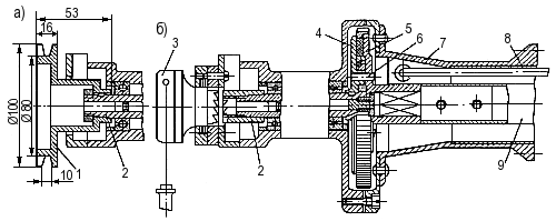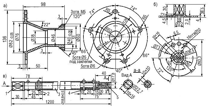 конусный переходник, дюраль; б — шлицевой диск, сталь 50; в — ведущий вал.