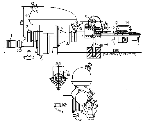 трубка системы охлаждения, медь Ø 6×1; 15 — ведущий вал; 16 — уключина, сталь;