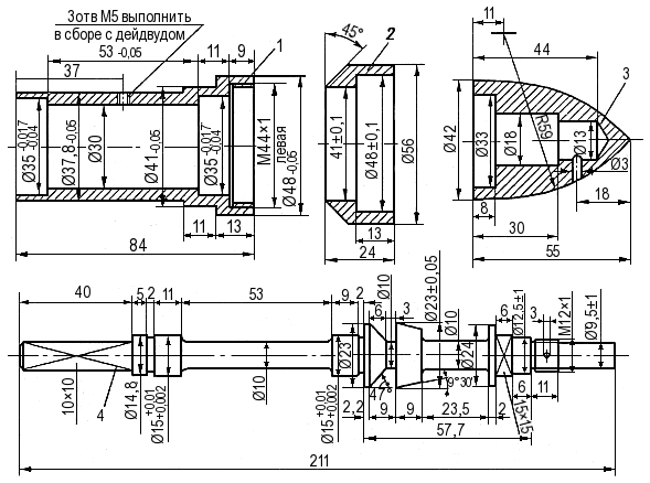 — наконечник, сталь У8-У12; 2 — заклепки, сталь; 3 — труба, дюраль; 4 — винт М4;