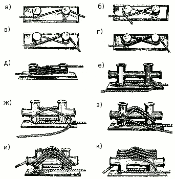 На рис. 35 е, ж, з, и, а также 35 к показаны два способа закрепления троса на так называемых крестовых кнехтах.