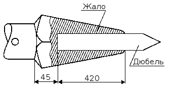 В качестве жала может с успехом использоваться дюбель. Тот самый, что специальным пистолетом вгоняют в бетонную стену. Он будет являться лишь ударной частью жала, а тело жала, в этом случае, должно быть единым целым с остальным наконечником. Обрезанный заводской дюбель вставляется в подготовленное для него гнездо методом горячей посадки. Диаметр углубления при этом должен быть на 0,05-0,1 мм меньше, чем диаметр используемого дюбеля. Маленькое предостережение из личного опыта: в пакетиках с дюбелями, которые вы купите в магазине или на рынке, попадаются совершенно сырые, не каленые.