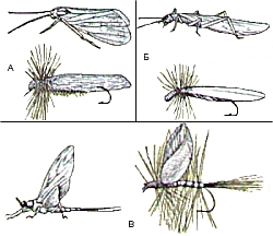 Рис. Трикоптер (А), поденка (Б) и плекоптер (В) во взрослом состоянии и их имитации
