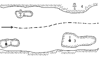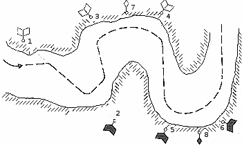 Ходовые знаки (7, 8) устанавливаются с расчетом обеспечения движения судов со знака на знак, а также между створно-перевальными и перевальными знаками. Весенние знаки устанавливаются на выступающих в сторону судового хода мысах и бровках пойменных берегов. На рис. 152 весенние знаки указывают опасные затопленные бровки берегов. Знаки 1 и 3 - правого берега, 2 и 4 — левого.