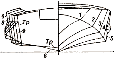 Моторная лодка «Обь» имеет остроскулый глиссирующий корпус с днищем «закрученного» типа с сужением кормы у транца и высоко поднятой скулой в носу (рис. 7). Важными элементами, повышающими остойчивость и мореходность лодки, являются бортовые наделки - були длиной по 2,5 м. Вместе с носовым герметичным отсеком они обеспечивают непотопляемость лодки. Общий объем булей - 65 л, носового отсека - 200 л.