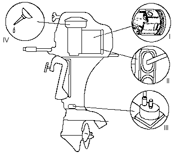 Рис. 94. Карта регламентных работ через 10-15 моточасов. I — проверка зазора и очистка запальных свечей; II — проверка и подтягивание крепежа; III — смена масла в редукторе. На моторе с модернизированным редуктором необходимо заполнить консистентной смазкой полость подшипника № 202