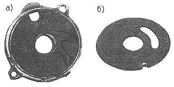 Рис. 91. Крыльчатка в корпусе водяного насоса (а) и пластина, устанавливаемая в расточку корпуса редуктора (6)