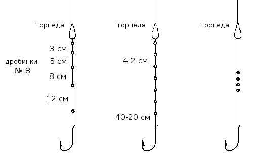Для всех этих типов огрузки общим является сосредоточение веса вблизи поплавка, что особенно рекомендуется для ловли наиболее осторожных рыб, например голавля, вырезуба и усача. В быстротекущих водах нужны торпеды в сочетании с дробинками.