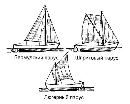 Наиболее простым является треугольный — бермудский грот, за ним следует шпринтовый парус. Несколько сложнее устройство люгерного (рейкового) паруса, хотя он также стоит лишь на одном фале. В этом варианте требуется больше усилий, чтобы туго вытянуть фалом переднюю шкаторину и поставить рей круто вверх.