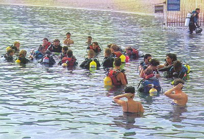 Занятия группы начинающих дайверов на мелкой воде, где пары могут спокойно проверить снаряжение друг друга