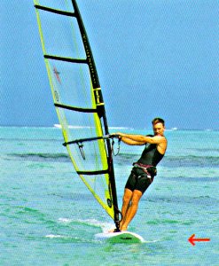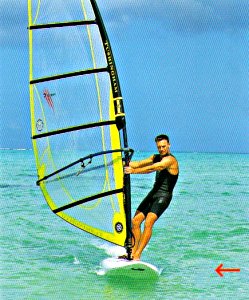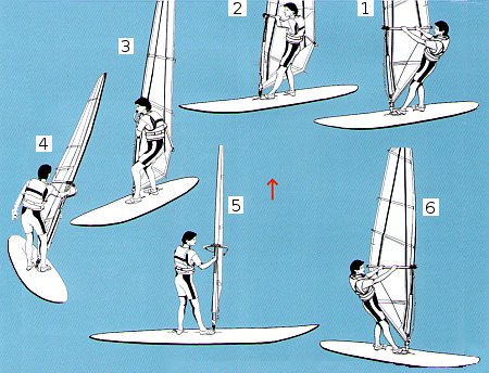 Наклонив парус к корме и обойдя мачту спереди, можно развернуть доску на 180º и пойти в обратном направлении.
