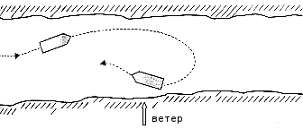 При наличии сильного бокового ветра поворот на обратный курс следует производить "на ветер", чтобы избежать навала судна на берег. Это правило особенно необходимо соблюдать при поворотах в узких участках (рис. 232).
