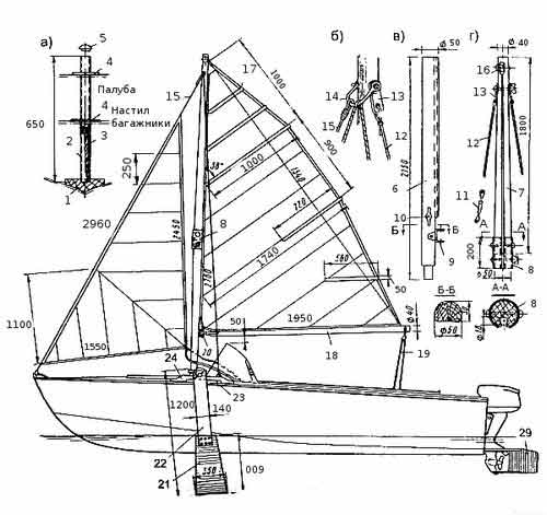 Степс можно сделать постоянным из дюралевой трубки подходящего диаметра и закрепить его с помощью фланцев-накладок к палубе и настилу багажника. Нижний конец трубки следует врезать в деревянный башмак, точно подогнанный по профилю днища. Бортовые шверцы вырезаются из дюраля 6 = 3 мм, надеваются стойками на концы шпилек в торцах поперечины и фиксируются барашковыми гайками. Поперечина своими концами ложится на продольные бортовые бруски, высота которых определяется прогибью палубы. Бруски постоянно прикрепляются к планширю болтами. Места их установки намечаются так, чтобы поперечина располагалась над стыком палубных листов перед ветровым стеклом. Под концы продольных брусков следует положить резиновые прокладки. По обеим сторонам от шпилек-осей устанавливаются вертикальные упоры для шверцов. Данное парусное вооружение можно применить и на других лодках сходных размерений.