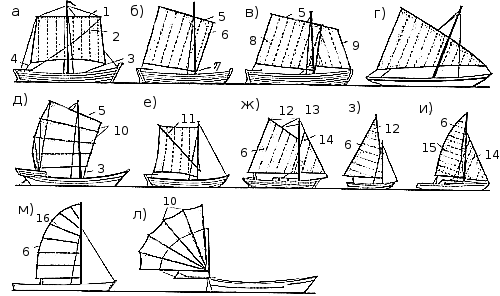 Рис. 43. Типы парусов прогулочных судов: а - прямой парус; (брифок); б - райковый (люгерный); в - разрез, фок; г - лат.; д - кит.; е - шпринтовый; ж - вафельный; з - гуари; и - бермуд.; к - бермуд. со сквоз.латами; л - "крыло летучей мыши"; 1 - рей; 2 - брас; 3, 7 - галсы; 4 - шкот; 5 - реек; 6 - грот; 8 - фок; 9 - кливер; 10 - бамбуковые рейки; 11 - шпринтов; 12 - гафель; 13 - дирик-фал; 14 - стаксель; 15 - лата; 16 - сквоз. лата.