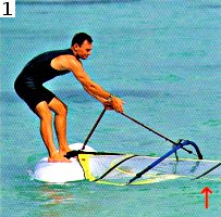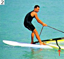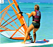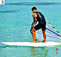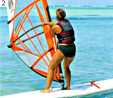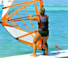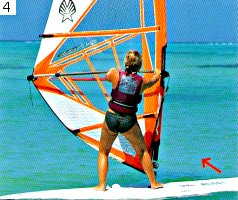 Шаг 2. Ухватитесь носовой рукой за гик ближе к мачте. При этом носовая нога должна стоять близко к основанию мачты, слегка развернутая к носу. (Носовые и кормовые нога и рука — термины, знакомые многим виндсерферам, но при непосредственном общении вместо них чаще говорят, соответственно, передние задние нога и рука.) Доска находится под прямым углом к ветру, благодаря чему ветер не наполняет парус. Не торопитесь и не напрягайтесь.