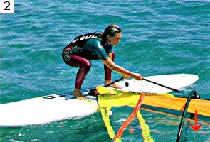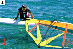 Шаг 1. Доска должна находиться под прямым углом к ветру, парус — с подветренной стороны. Встаньте спиной к ветру и лицом к доске, обопритесь на нее обеими руками по разным сторонам от мачты. Удерживая центр тяжести посредине, заберитесь на доску. Ухватитесь ближней к носу (далее — носовой) рукой за старт-шкот. Так вам будет легче сохранять равновесие.