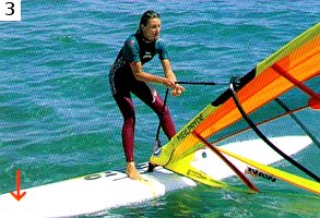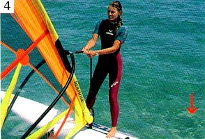 Шаг 4. Когда парус полностью вышел из воды, для удержания мачты требуется меньше усилий, поэтому выпрямитесь и больше не отклоняйтесь назад. Сохраняйте равновесие, при этом ваше тело и мачта должны образовать фигуру, по форме сходную с буквой V, ступни — пересекать диаметральную плоскость, а пятки — находиться с наветренной стороны. Не поднимайте мачту совсем вертикально, между ней и вашим туловищем должна сохраняться дистанция. Добейтесь, чтобы гик полностью выходил из воды, а доска держалась под прямым углом к ветру.