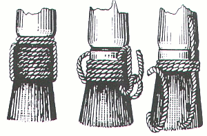 Для сохранения рабочей части кисти и достижения большей упругости при работе кисти повязывают (обвязывают). При подвязке кистей (рис. 63) сначала связывают из короткого куска шпагата петлю у оправы кисти, из другого куста шпагата накладывают вторую петлю на щетину и этим же куском накладывают на щетину марку, начиная от оправы и оставляя коренной конец шпагата со стороны щетины.