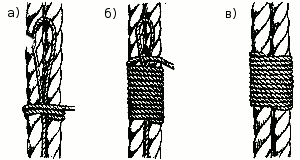 Как показано на рис. 56 а, конец линя укладывают вдоль троса в виде петли, после чего оба троса туго стягивают шлагами линя.