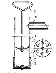 Простейшая помпа - в качестве цилиндра 1 (рис. 64) используется отрезок тонкостенной трубы диаметром 40-65 мм. Длина трубки подбирается такой, чтобы нижний конец доставал до киля внутри лодки, а верхний выступал за борт при наклонном положении помпы. У верхнего конца вваривается отливной патрубок 5 длиной 150-300 мм, который при работе укладывается на планширь лодки.