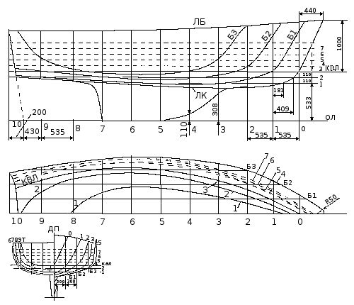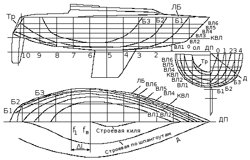 При этом помним, что между ЛБ, Б1... ВЛЗ имеются определенные (лучше одинаковые) расстояния. Эти расстояния должны быть учтены в дальнейших расчетах площадей шпангоутов и объемов шпаций. Ниже приведем два примера теоретических чертежей яхт. Рассмотрите их внимательно. Они выполнены несколько в иных обозначениях, но суть одна: задана форма корпуса.