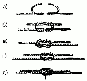 Для предотвращения чрезмерного затягивания в петли узла вводят деревянный вкладыш (рис. 1 д).