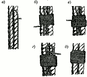Вдоль скрепляемых тросов укладывают один из концов линя и сложенную вдвое плетенку, так называемый проводник (рис. 58 а) После этого на тросы накладывают два ряда шлагов (рис. 58 б, в).