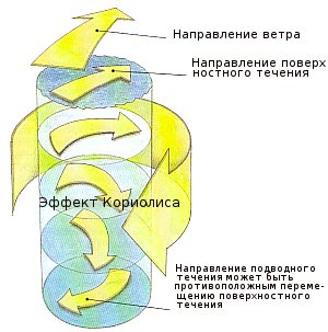 Вода не следует точно за ветром, а перемещается с отклонением в 45 к направлению ветра (45º влево в Южном полушарии и 45 вправо в Северном). Это явление известно как эффект Экмана применительно к водяному столбу и является следствием вращения Земли (сила Кориолиса)