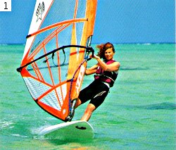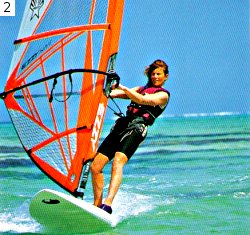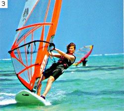 Шаг 3. Отклонитесь ог гика, выпрямите и расслабьте руки. Старайтесь их не сгибать, иначе тросик может отстегнуться. Кроме того, при резком порыве ветра, если вы не будете сидеть, вас поднимет на пальцы ног или даже бросит на парус. |