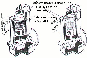 Объем цилиндра, освобождаемый поршнем при движении между мертвыми точками называется рабочим обьемом цилиндра (Vh). Рабочий объем (литраж) двигателя (Vл) равен сумме рабочих объемов всех цилиндров, выраженной в литрах.