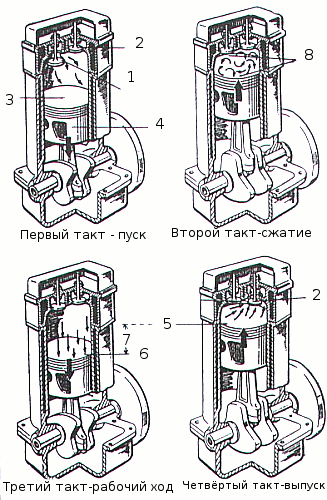 Рис. 78. Характеристика рабочего процесса двигателя: 1 - впускной клапан; 2 - выпускной клапан; 3 - днище поршня; 4 - юбка поршня; 5 - верхняя мертвая точка (в.м.т.); б - нижняя мертвая точка (н.м.т.); 7 - ход поршня; 8 - камера сгорания.