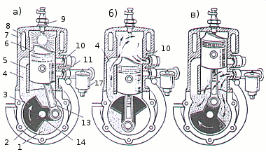 Рис. 79. Схема действия двухтактного карбюраторного двигателя: 1 - картер; 2 - коленчатый вал; 3 - противовес; 4 - продувочный канал; 5 - поршень; 6 - дефлектор; 7 - цилиндр; 8 - полость охлаждения; 9 - свеча зажигания; 10 - выпускной канал; 11 - канал подачи горючей смеси от карбюратора в картер; 12 -карбюратор; 13 - шатун; 14 - кривошип коленчаотого вала