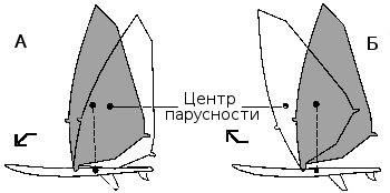 У каждого паруса имеется центр приложения силы, или центр парусности (ЦП), то есть точка, к которой прикладывается сила паруса, или тяга. Обычно она располагается ближе к центру паруса, примерно на высоте головы. ЦП сбалансирован относительно центра бокового сопротивления (ЦБС). который находится приблизительно посредине доски и вокруг которого она разворачивается. При слабом ветре поворот по ветру совершается за счет того, что парус наклоняется вперед, так, чтобы ЦП был ближе к носу относительно ЦБС. За счет этого нос разворачивается по ветру. Если же наклонить парус назад — так, чтобы ЦП относительно ЦБС был ближе к корме, — то общая сила будет толкать по ветру корму, а нос, соответственно, повернется против ветра. Такие повороты можно совершать короткими или длительными движениями — в зависимости от того, насколько градусов вы хотите повернуть доску.