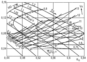 Результаты модельных испытаний серий осевых насосов при различных шаговых отношениях H/D или углах поворота лопастей рабочего колеса обычно представляют в форме универсальных диаграмм, связывающих коэффициенты расхода КQ и напора КH с КПД насоса зр , а также с критическим числом кавитации дsкр, при котором начинается срыв напорных характеристик.