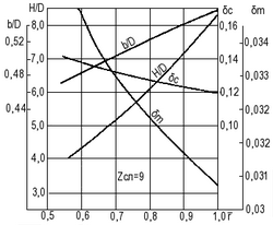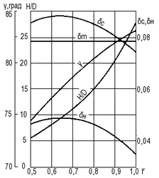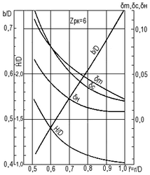 Рис. 23. Геометрические характеристики спрямляющих лопаток для шестилопастного ротора (zса = 9; dст = 0,55).
