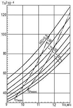 Снимая далее соответствующие значения Tn2, Vo и ηр на каждой линии H/D, можно построить зависимости параметра Тn2 и КПД полной тяги ηт от Vo (см. рис. 16 и 17).