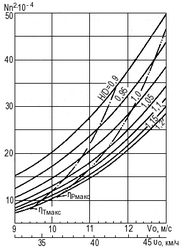 Формулы (1) и (2) в комплексе с (3) и кривой формула стр. 29 на рис. 12 б позволяют при заданном δsкр, ограничивающем область оптимальных режимов выбранного насоса, рассчитать и построить диаграмму Tn2 — Vо в осях КHпотр — КQпотр. Совмещение таких диаграмм по осям КH и KQ с универсальными диаграммами ряда типовых насосов позволяет оперативно оценить степень их пригодности в отношении достижимой скорости и развиваемой при этом тяги. На рис. 13 показано совмещение диаграммы Tn2 — Vo, рассчитанной для δsкр = 3, с расходно-напорными характеристиками серии четырехлопастных насосов (описание насосов можно найти в 3 и 5 списка литературы).
