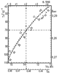 Рис. 20. Номограмма для определения оптимальных параметров водомета с шестилопастным ротором.